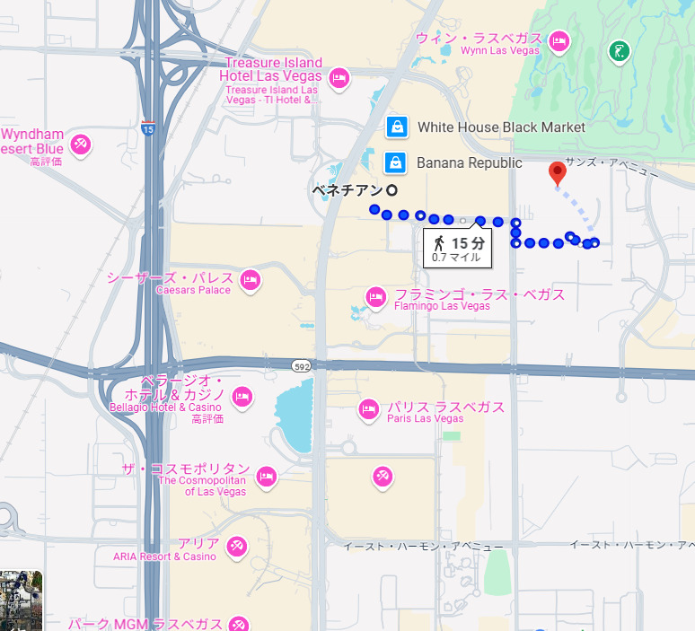意外と遠いんです、、ベネチアンのホテルの後ろくらいにあるんですが、